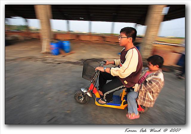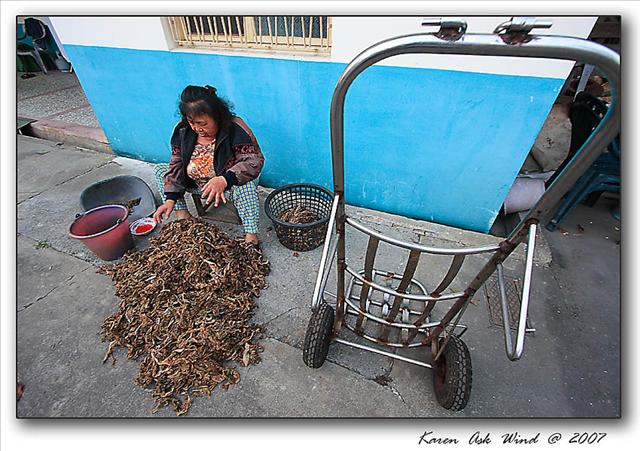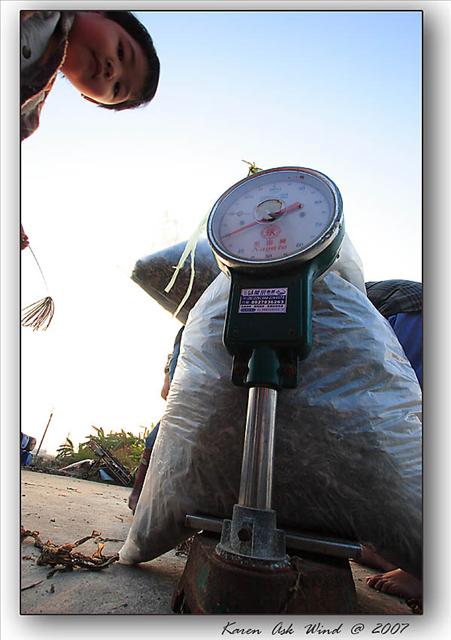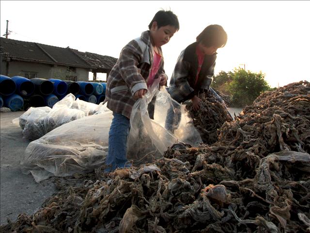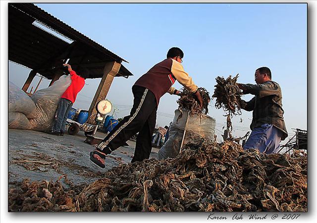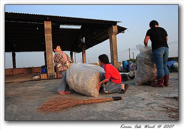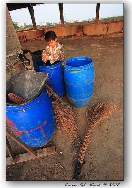 我們在一個小型酸菜工廠的庭院裏看到三個小朋友在裝像梅乾扣肉用的酸菜