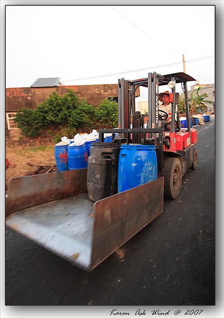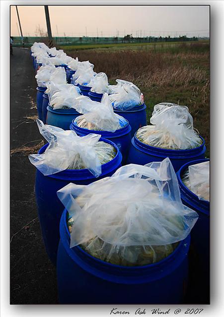 酸菜就一桶桶的裝在藍色的塑膠桶裏放在路邊封著