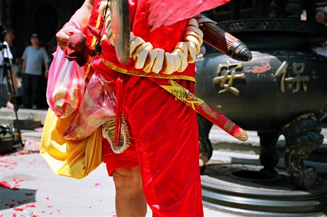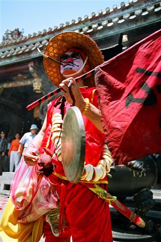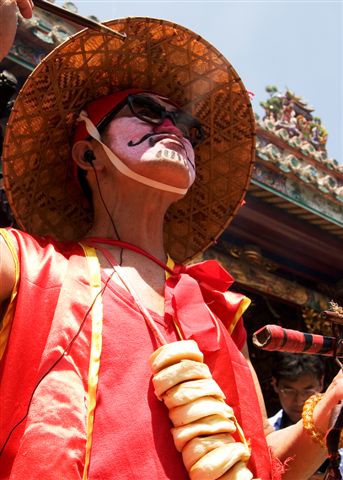 背著一圈的平安餅 腰著一把刀 穿著草鞋 戴著斗笠 拿著令旗