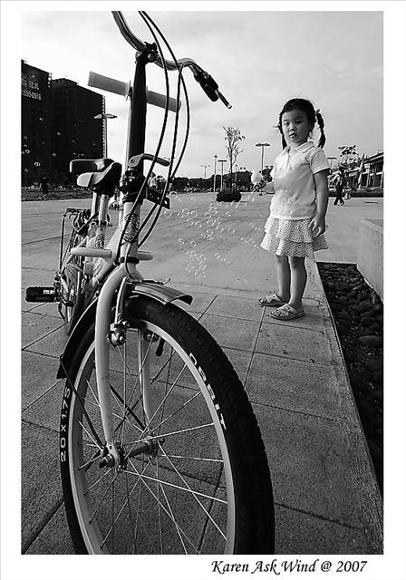 這張拍時我刻意以腳踏車為前景 小妹妹吹泡泡在右邊較空的畫面上