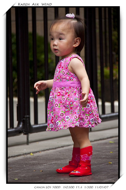 <粉紅花裙配紅鞋紅襪,還真是一整個紅通通>