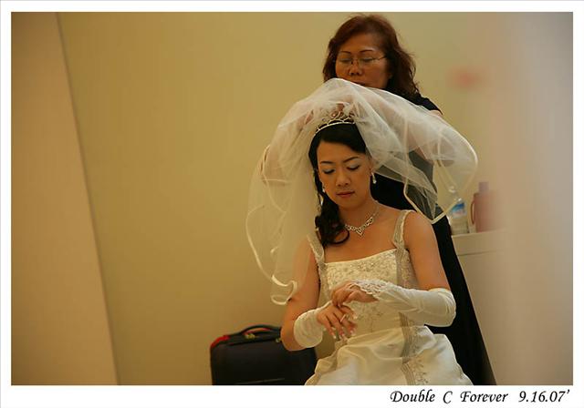 【婚禮公司的人在幫Christine化妝,禮服是在香港試的,再帶到關島去】
