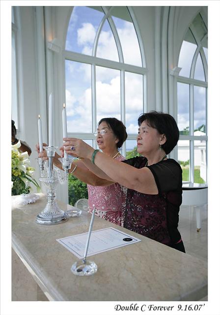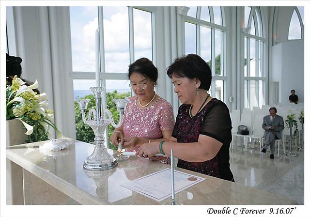 【在新郎新娘進場前,雙方的母親要一起上台去點上蠟燭,代表二個不同家庭的光源】