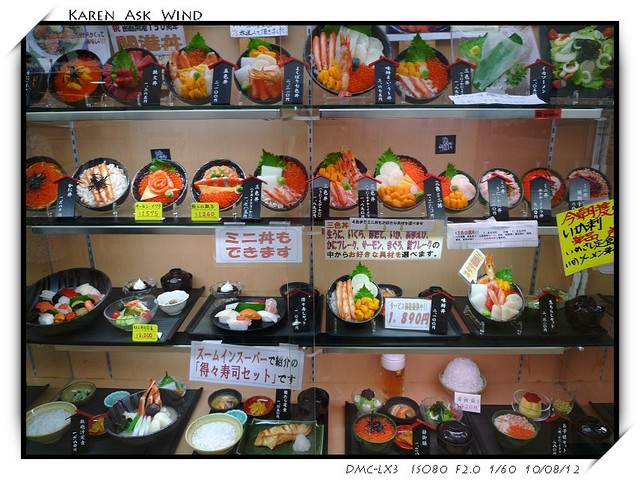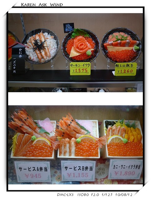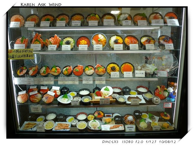 每家店前面都擺有各種海鮮定食的模型