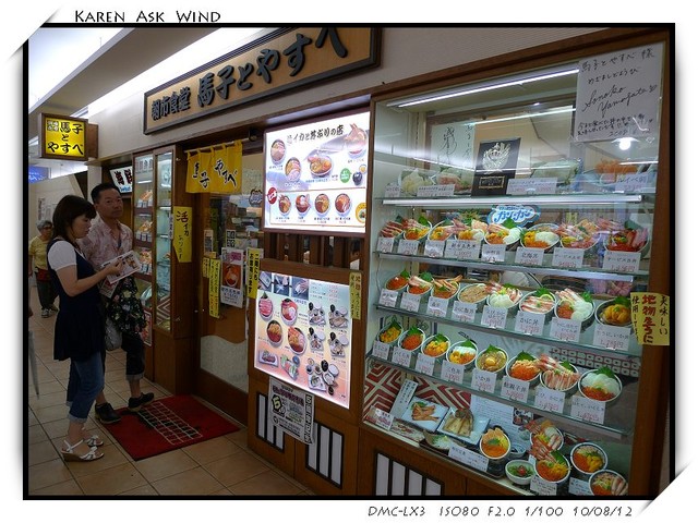 一個建物的走道二側全都是賣海鮮蓋飯之類的餐廳